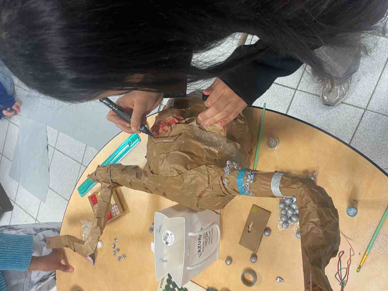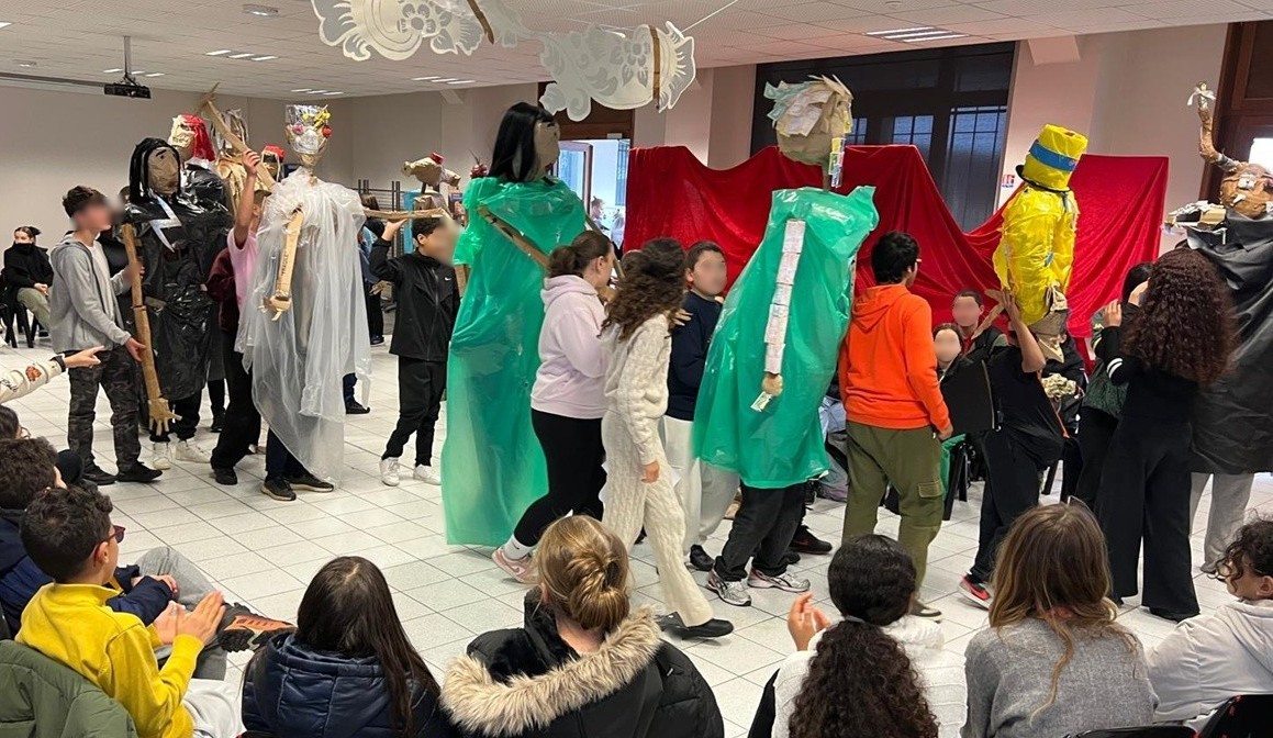 Au cours de quatre demi-journées de travail, les élèves ont ainsi pu s'initier à l manipulation de marionnettes avant de s'atteler, par petits groupes, à la fabrication proprement dite de leur personnage. La semaine s'est conclue par un grand défilé musical, devant trois classes invitées. La déesse du réconfort, le dieu des donuts, des volcans ou la divinité de la santé mentale ont ainsi pu côtoyer le dieu des bricolages insolites ou la divinité de la Nature !